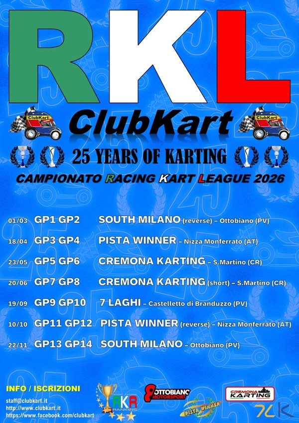 Sono aperte le iscrizioni per la Racing Kart League 2026 Cari Piloti, Racing Kart League è lieta di presentarvi il Campionato RKL 2026! 4 piste…